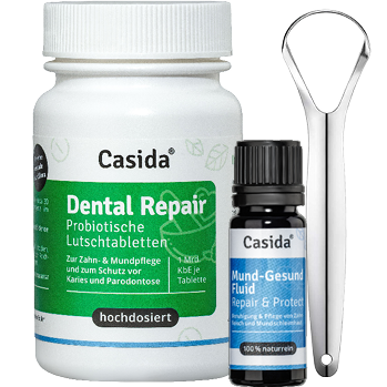 Probiotika von Casida® enthalten jeweils spezifische Bakterienstämme für die Gesunderhaltung der Mundflora, der Darmflora oder der Blasenschleimhaut. So enthalten die Dental Produkte schützende Bakterienstämme, die das Zahnfleisch pflegen und Zahnfleischproblemen vorbeugen. Die enthaltenen Mikroorganismen unterstützen das Gleichgewicht der Mundflora, die durch Rauchen, Stress, Antibiotika-Therapien oder eine zuckerreiche Ernährung gestört wird. Der Probiotika Komplex hingegen enthält Bakterienstämme speziell zur Unterstützung einer gesunden Darmflora. Ein gesunder Darm spielt eine zentrale Rolle für das allgemeine Wohlbefinden und das Immunsystem. Mit den nützlichen und gesundheitsfördernden Mikroorganismen des Probiotika Komplex wird der Aufbau der Darmflora unterstützt – besonders auch bei Störungen des Magen-Darmtraktes und nach Antibiotika-Einnahme.