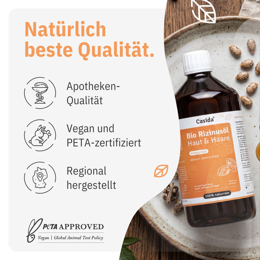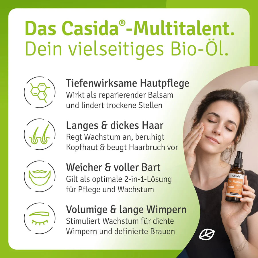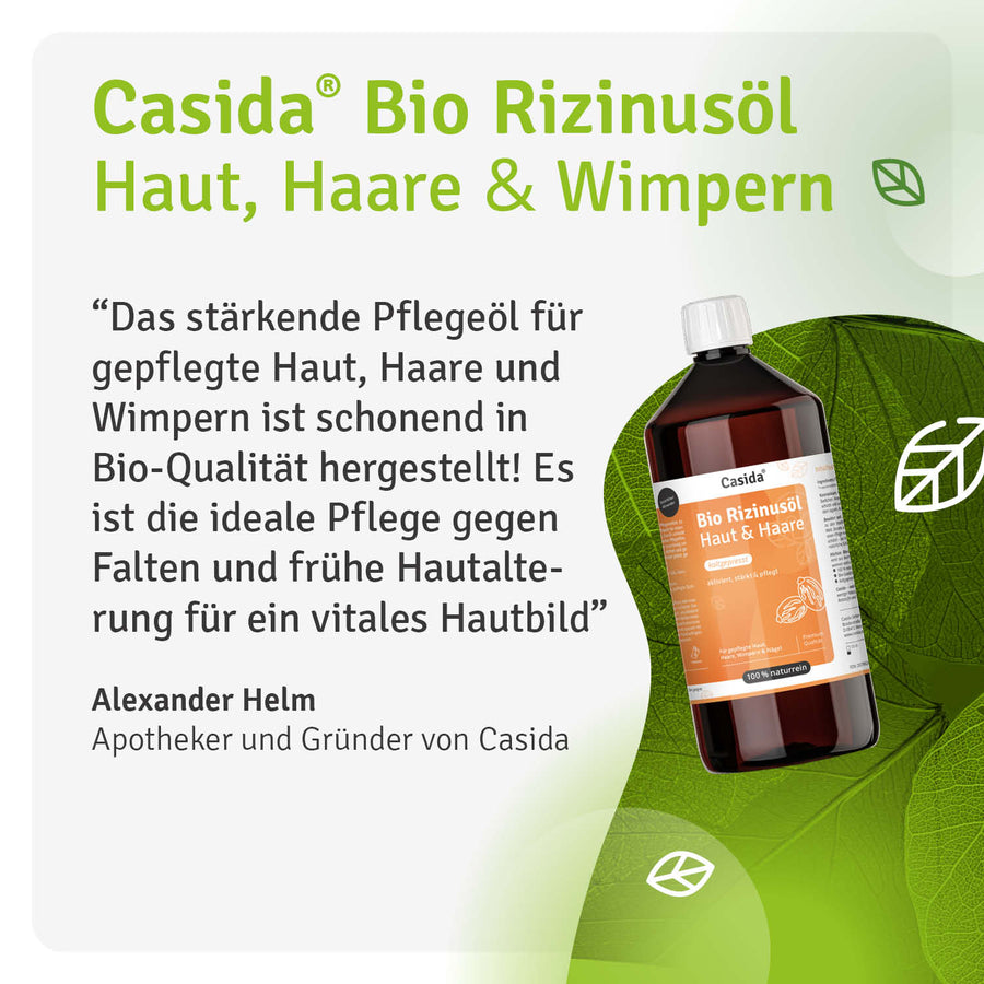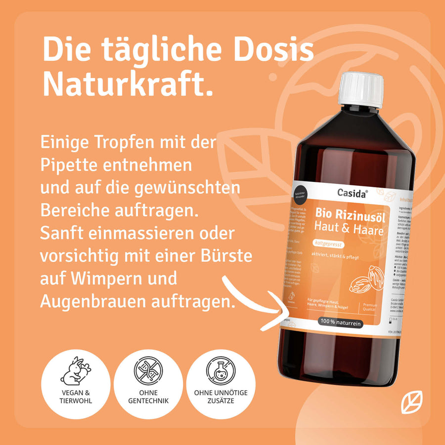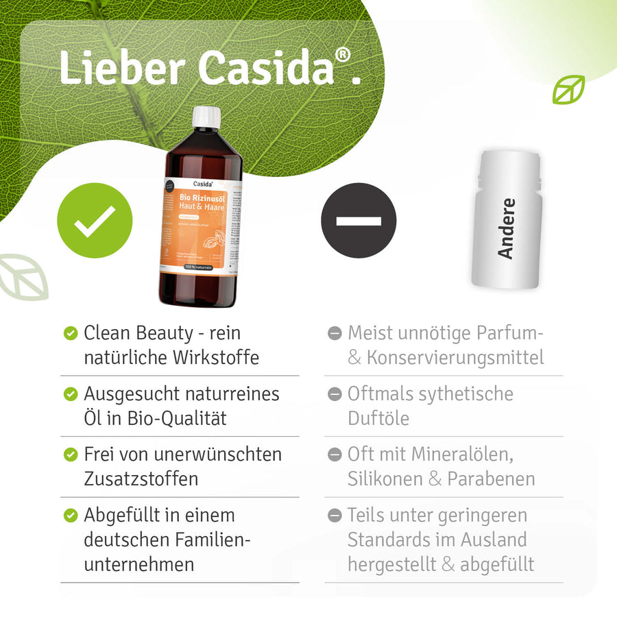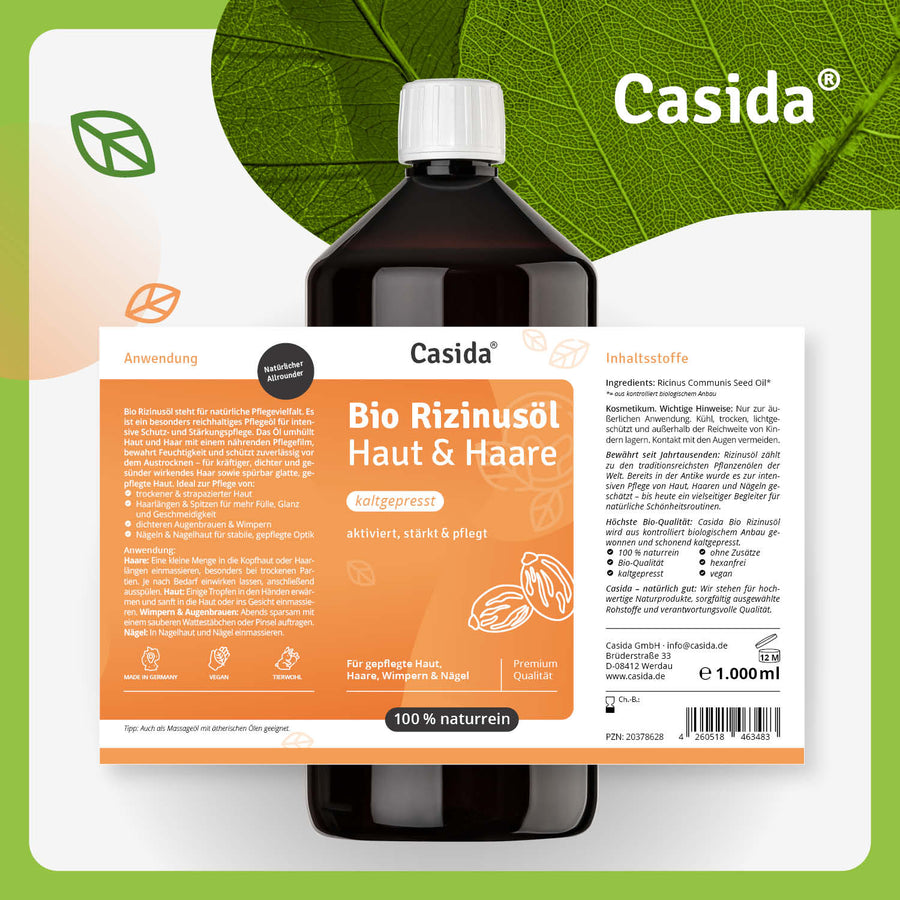 The large 1000 ml supply bottle opens up versatile application possibilities - ideal for families, frequent users, or for making your own care and cosmetic products. Casida castor oil is a true natural talent with traditional use in beauty and body care. The rich texture supports optimal moisture supply.