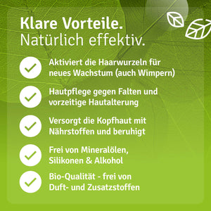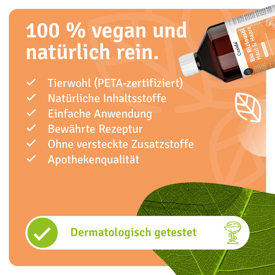 Thanks to its high content of natural fatty acids, castor oil is particularly well-suited for dry or stressed skin and the care of hair roots, lengths, and tips. Eyelashes and eyebrows also benefit from a healthy, strong appearance with regular use.