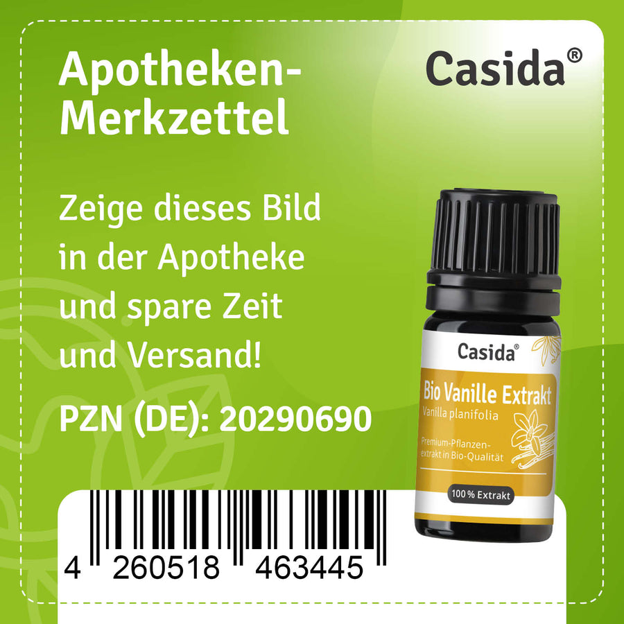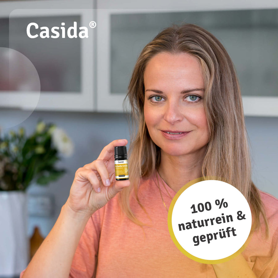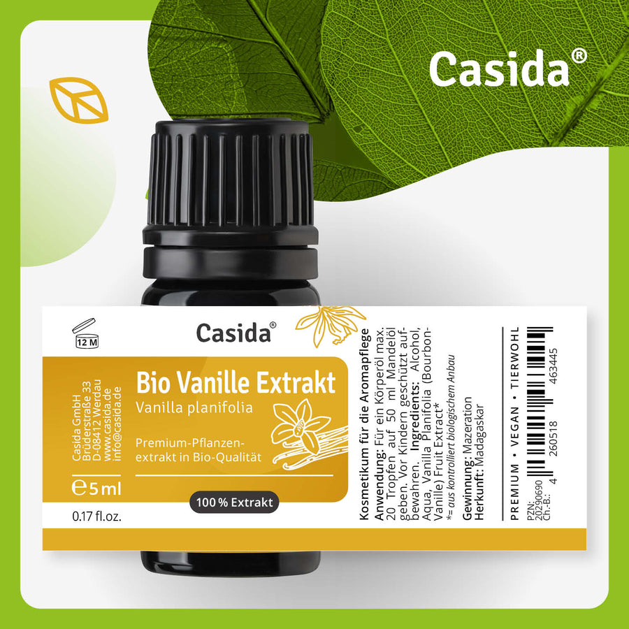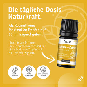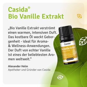 Tauche ein in den sinnlich-sanften Duft der Bourbon-Vanille: Der Bio Vanille Extrakt von Casida verwöhnt Körper und Geist mit seinem warmen, harmonisierenden Aroma. Hergestellt aus hochwertigen Vanilleschoten aus kontrolliert biologischem Anbau, eignet sich dieser Extrakt perfekt für die Verwendung im Diffuser, in Körperölen oder als natürlicher Raumduft.