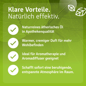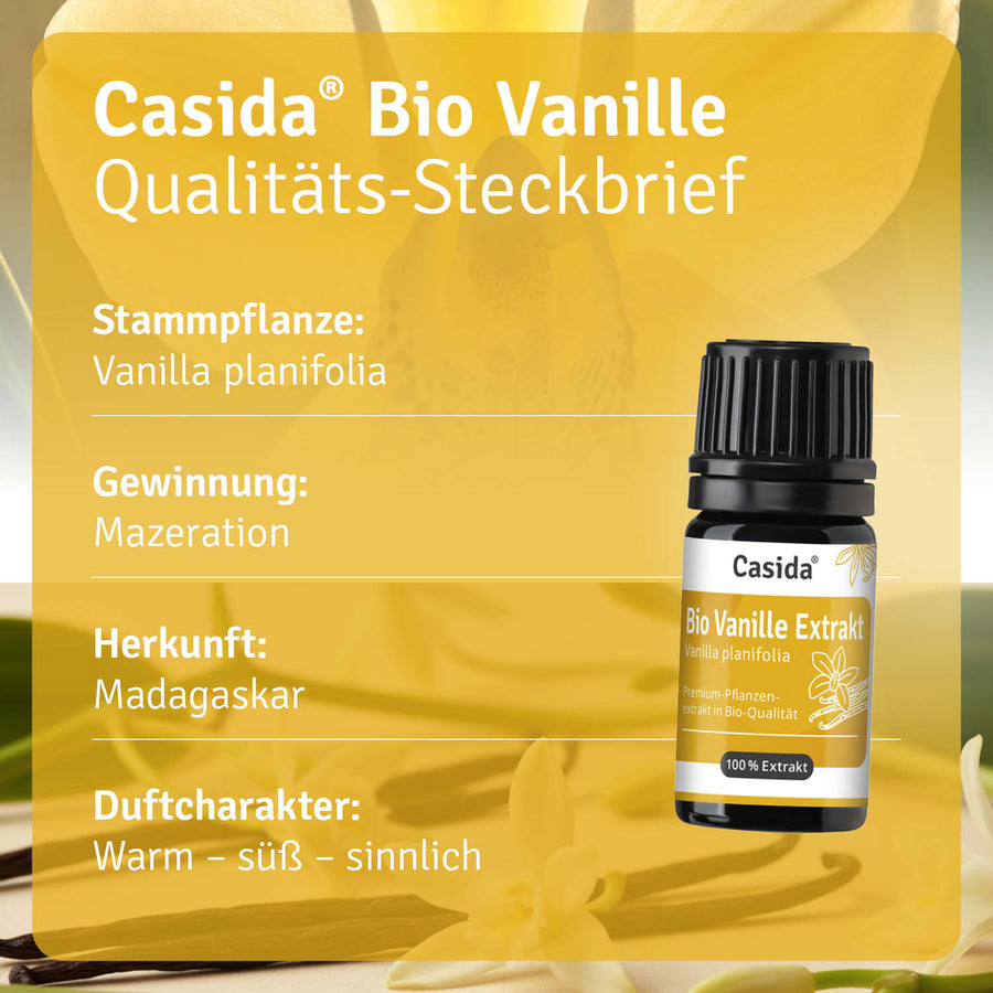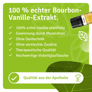 Ein klassisches ätherisches Vanilleöl ist selten, da Vanille nicht durch Destillation, sondern durch Extraktion gewonnen wird. Daher spricht man bei Vanille meist von Extrakt oder Absolue. Die Wirkung und der Duft sind jedoch vergleichbar – natürlich, intensiv und angenehm süß-warm.