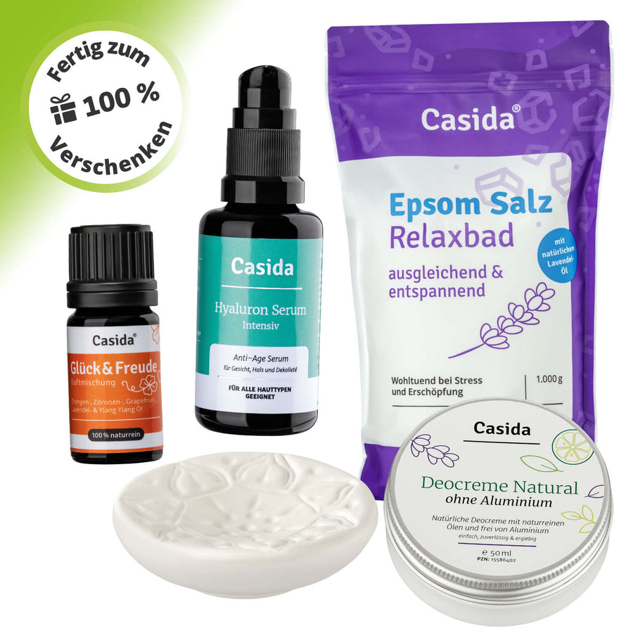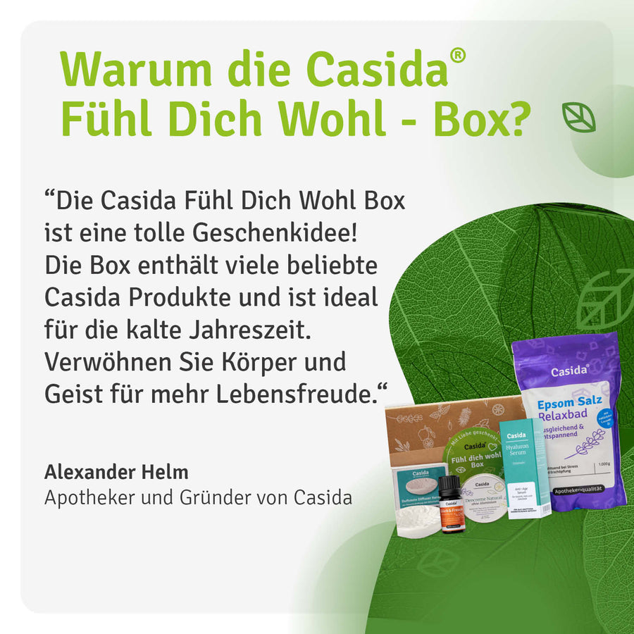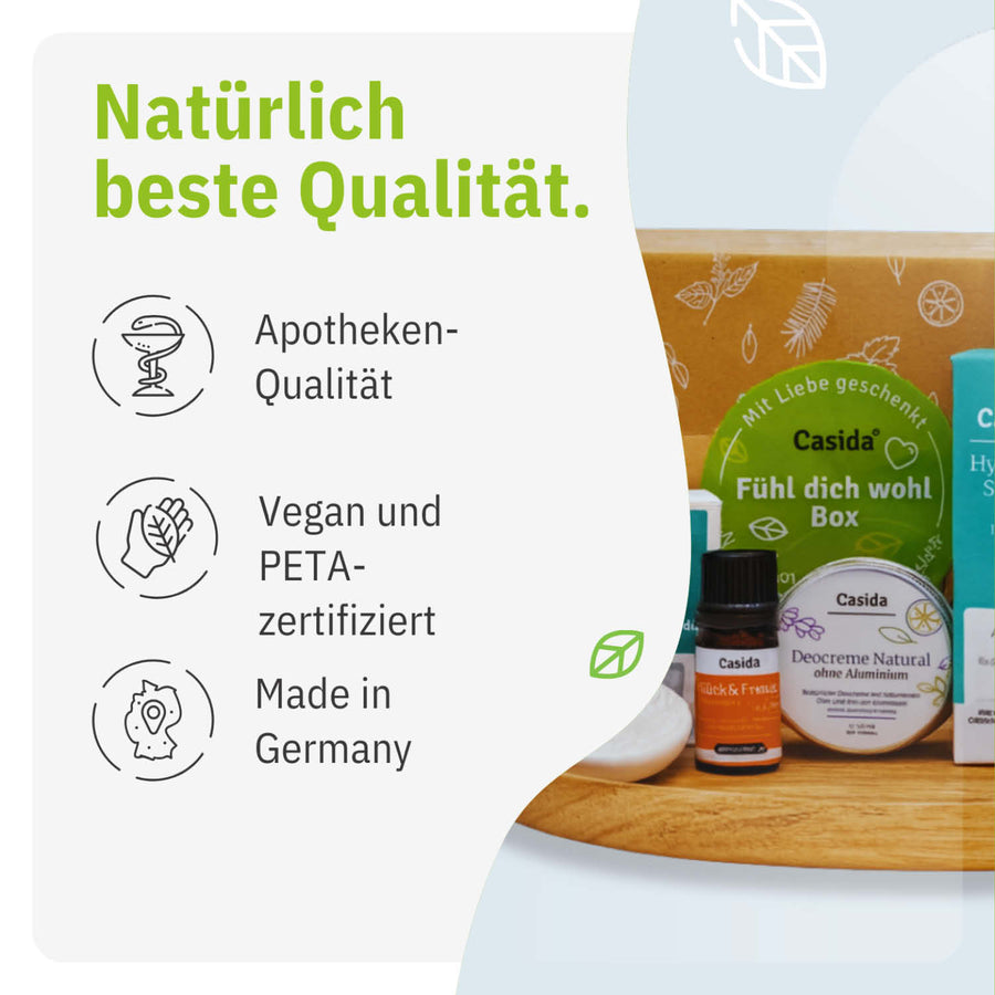 The Casida "Feel Good Box" contains five complete products for natural health and beauty care for HER and HIM. Packaged in a sustainable gift box. Everything for a feel-good routine with unisex fragrances and purely natural ingredients. Give the gift of a relaxing break and save 50% compared to individual purchases!
