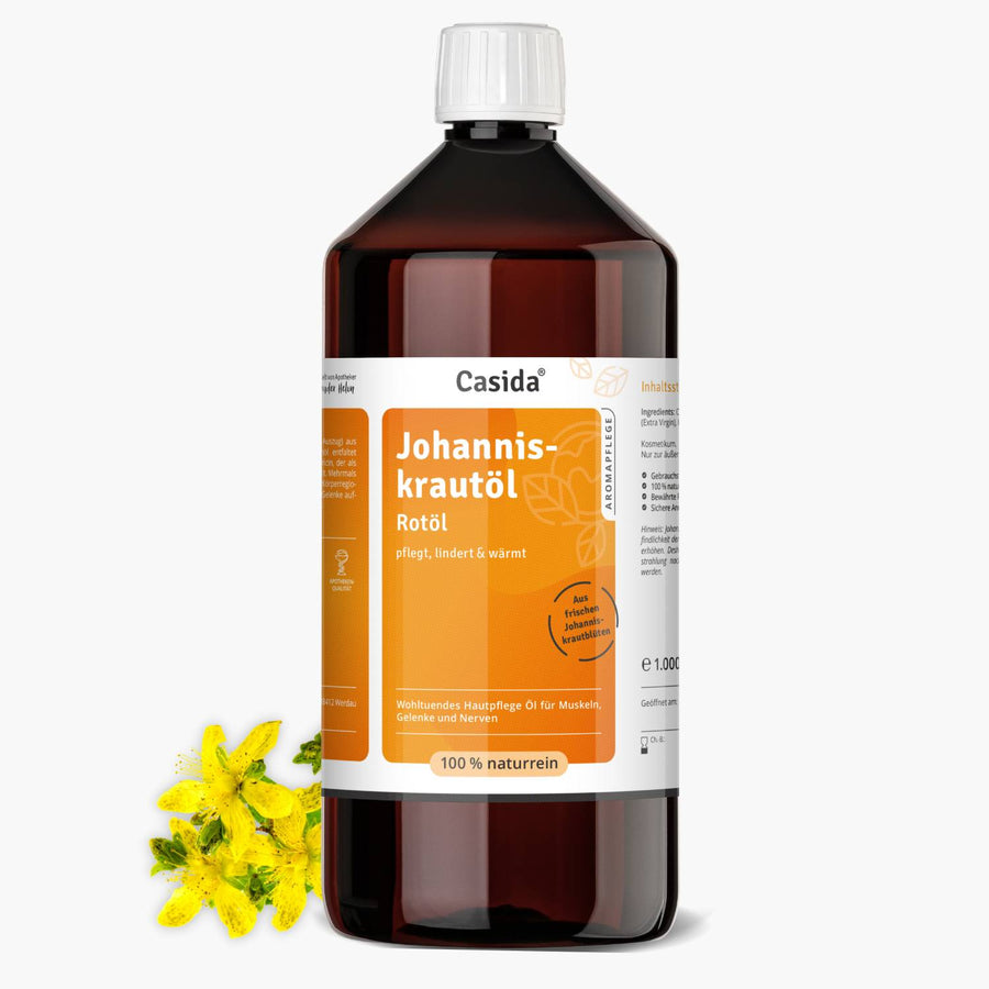 It is a wonderful care oil for skin problems and for a warming massage. The oil is said to have anti-inflammatory, wound-healing, and nerve-calming properties. Applied externally, it can care for dry and sensitive skin, relieve back problems, and muscle and joint pain. A massage with Casida St. John's Wort red oil is truly beneficial. The warming effect reaches the muscles and joints and brings noticeable relaxation.