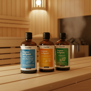Die Casida® Saunaaufgüsse „Waldluft“, „Zitrustraum“ und „Atme durch mit Menthol“ basieren auf 100 % naturreinen ätherischen Ölen. Je nach Pflanze werden die Öle schonend durch Wasserdampfdestillation (z. B. Nadelhölzer, Pfefferminze, Eukalyptus, Lemongras) oder durch Kaltpressung (z. B. Zitrone, Grapefruit, Mandarine) gewonnen.