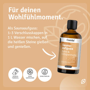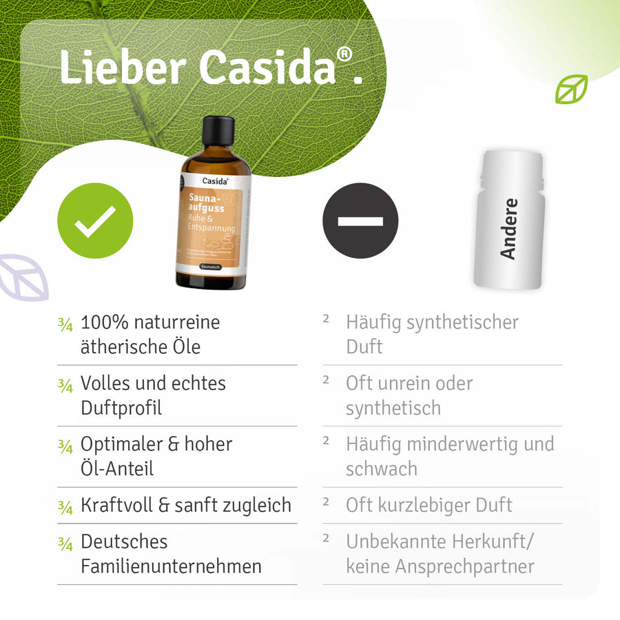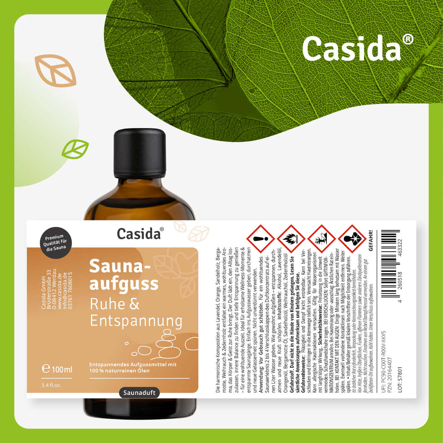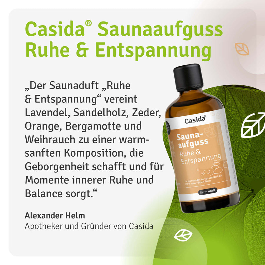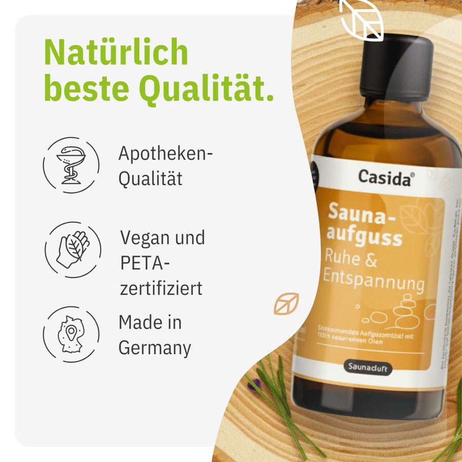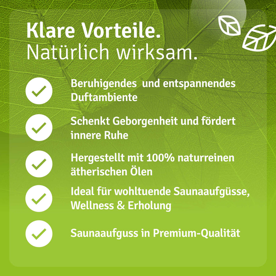 Der Saunaaufguss „Ruhe & Entspannung“ ist mehr als nur ein Duft – es ist ein Stück Natur bei jedem Aufguss. Die ätherischen Öle sind 100 % naturrein und werden schonend durch Wasserdampfdestillation bzw. Kaltpressung gewonnen. Dadurch bleiben nicht nur die wertvollen Duftstoffe, sondern auch ihre aromatherapeutischen Eigenschaften vollständig erhalten.