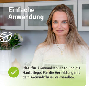 Wir empfehlen die Vernebelung einiger Tropfen des Öls in Wasser mit einem Diffuser oder die Anwendung einiger Tropfen ätherischer Öle in einem Trägeröl.