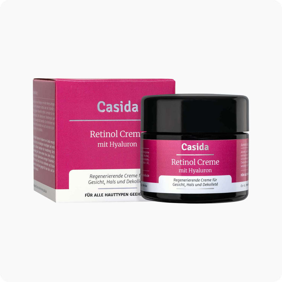 • Retinol Creme mit Hyaluron: Fördert die Erneuerung der Hautzellen, Hyaluron polstert Fältchen auf und sorgt für ein ebenmäßiges Hautbild.