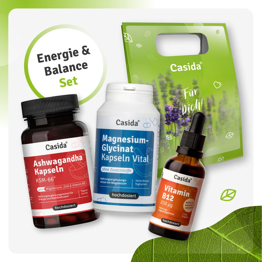 Unser modernes Leben ist oft geprägt von Stress, Leistungsdruck und zu wenig Regeneration. Müdigkeit, Erschöpfung oder Konzentrationsprobleme können die Folge sein. Das Casida® Energie & Balance Set kombiniert bewährte Pflanzenstoffe, Mineralstoffe und Vitamine, die Körper und Geist in herausfordernden Zeiten unterstützen.