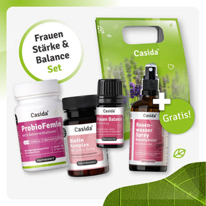 Das Casida® Frauen Stärke & Balance Set vereint hochwertige Produkte zur Unterstützung der inneren und äußeren Balance der Frau. Es kombiniert wertvolle Milchsäurebakterien für die Vaginal- und Blasenflora, eine ausgleichende Duftmischung, essentielle Nährstoffe für Haut, Haare und Nägel – sowie als Gratis-Zugabe ein erfrischendes Rosenwasser Spray in Bio-Qualität.