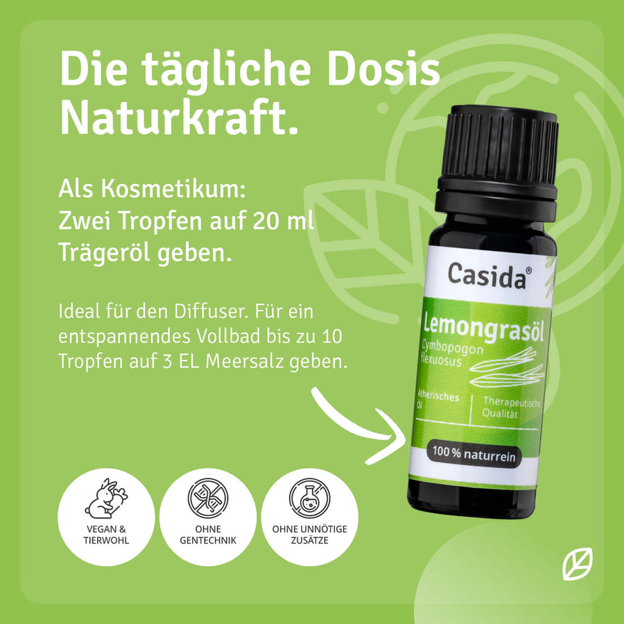 Durch die streng kontrollierten Inhaltsstoffe ist unser Lemongrasöl absolut rein und natürlich. Die patentierte Violettglasflasche schützt das wertvolle ätherische Öl vor UV-Einwirkung. Ideal geeignet für die Anwendung in Aromadiffusern, Duftlampen oder zur individuellen Duftgestaltung – besonders geschätzt für seine frische, belebende Duftnote. Selbstverständlich verzichten wir konsequent auf Tierversuche.