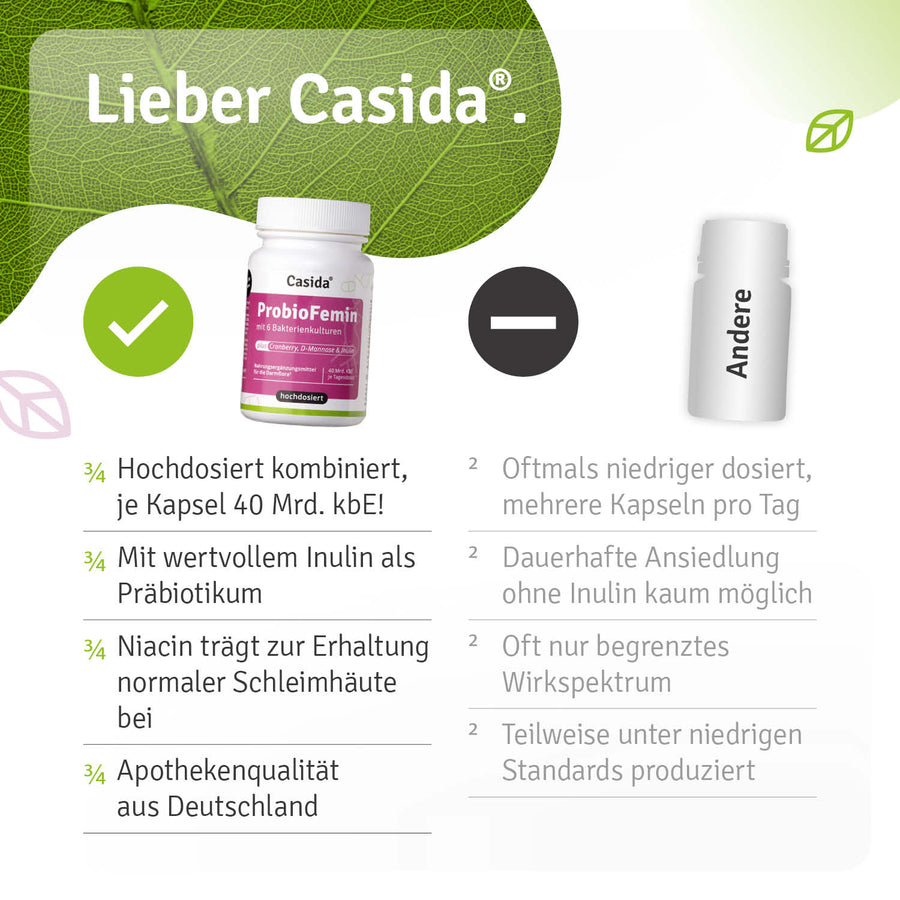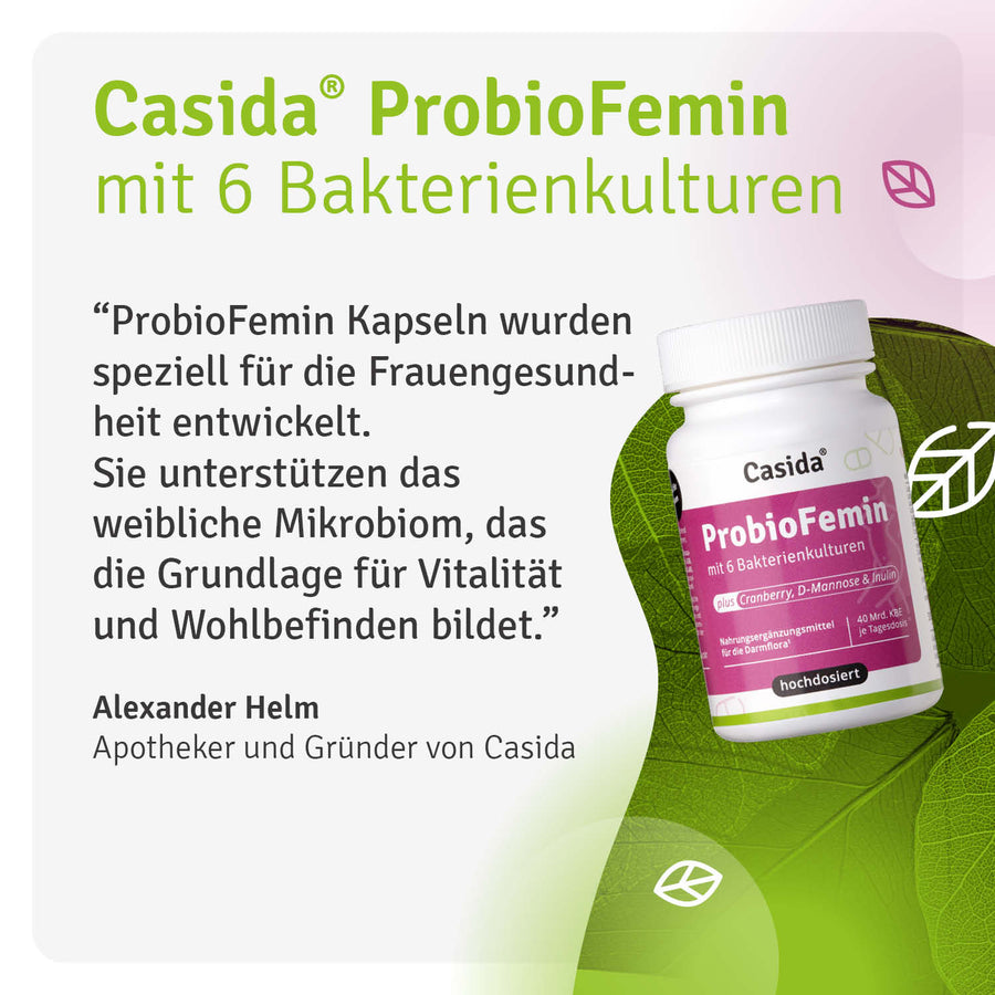 Casida ProbioFemin wurde speziell für Frauen entwickelt, um das natürliche Gleichgewicht der Schleimhäute* im Intimbereich, Darm und Blase zu unterstützen. Die sorgfältig abgestimmte Kombination aus Milchsäurebakterien, Präbiotika, Vitaminen und pflanzlichen Inhaltsstoffen trägt zu einem stabilen und harmonischen Mikrobiom bei – eine wichtige Grundlage für das weibliche Wohlbefinden.