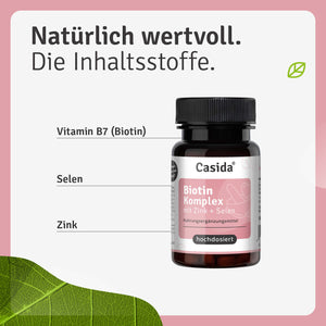 Der Biotin Komplex mit Zink & Selen ist die ideale Ergänzung für Hautregeneration und gesunde Haare! Bitte täglich eine Tablette mit etwas Flüssigkeit einnehmen.