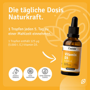 Vitamin D3: 1 Tropfen jeden 5. Tag zu einer Mahlzeit einnehmen. 1 Tropfen enthält 125 μg (5000 I.E.) Vitamin D3 (Cholecalciferol). Dies entspricht 2500% der empfohlenen Tageszufuhr gemäß EU-Lebensmittelinformationsverordnung.