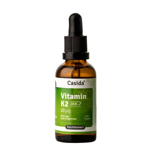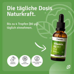 Vitamin K2: 4 Tropfen täglich unverdünnt einnehmen. 1 Tropfen enthält 20 µg Vitamin K2.